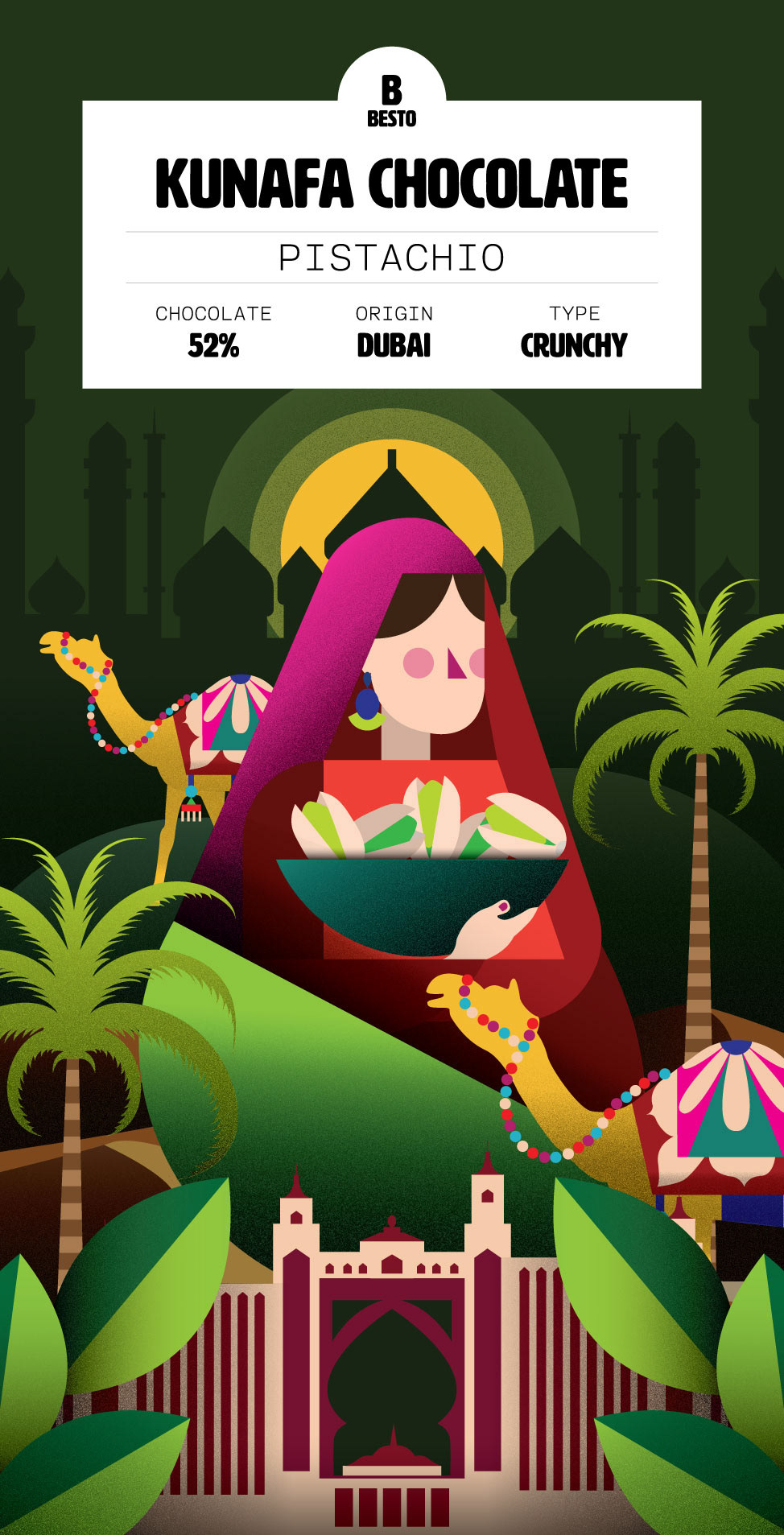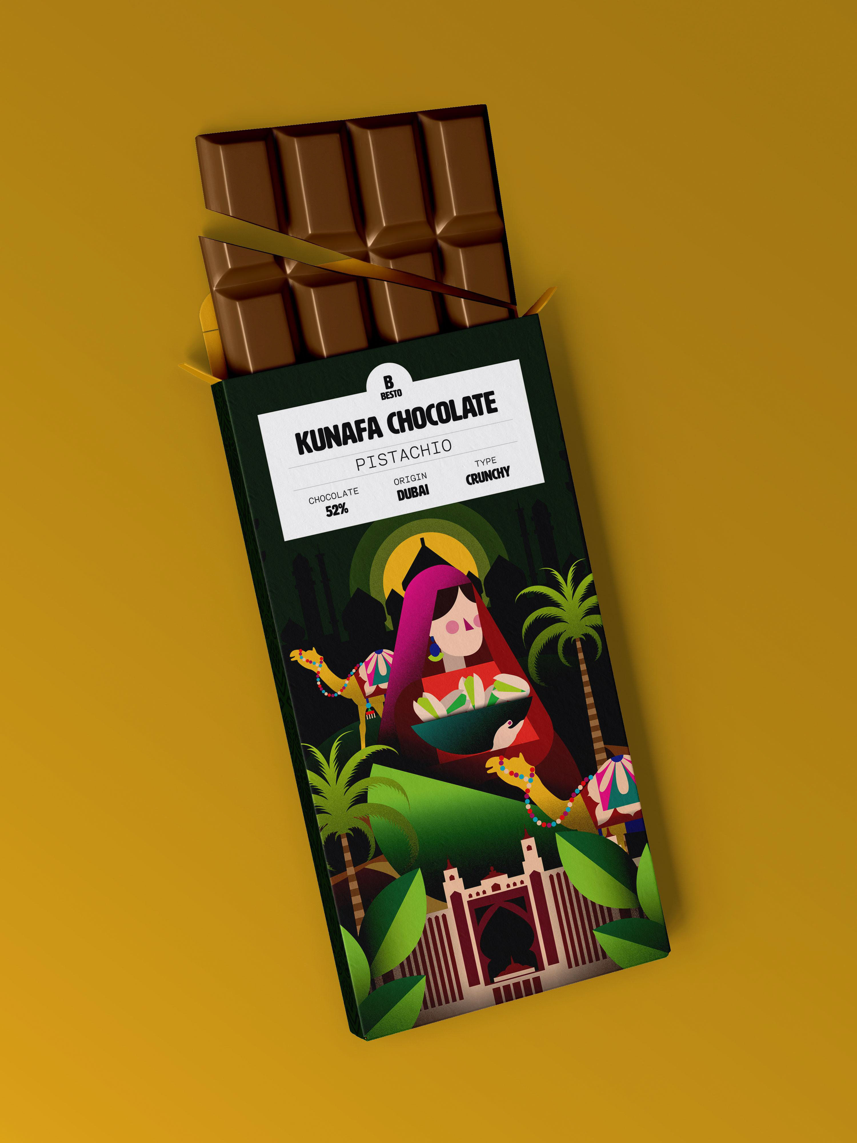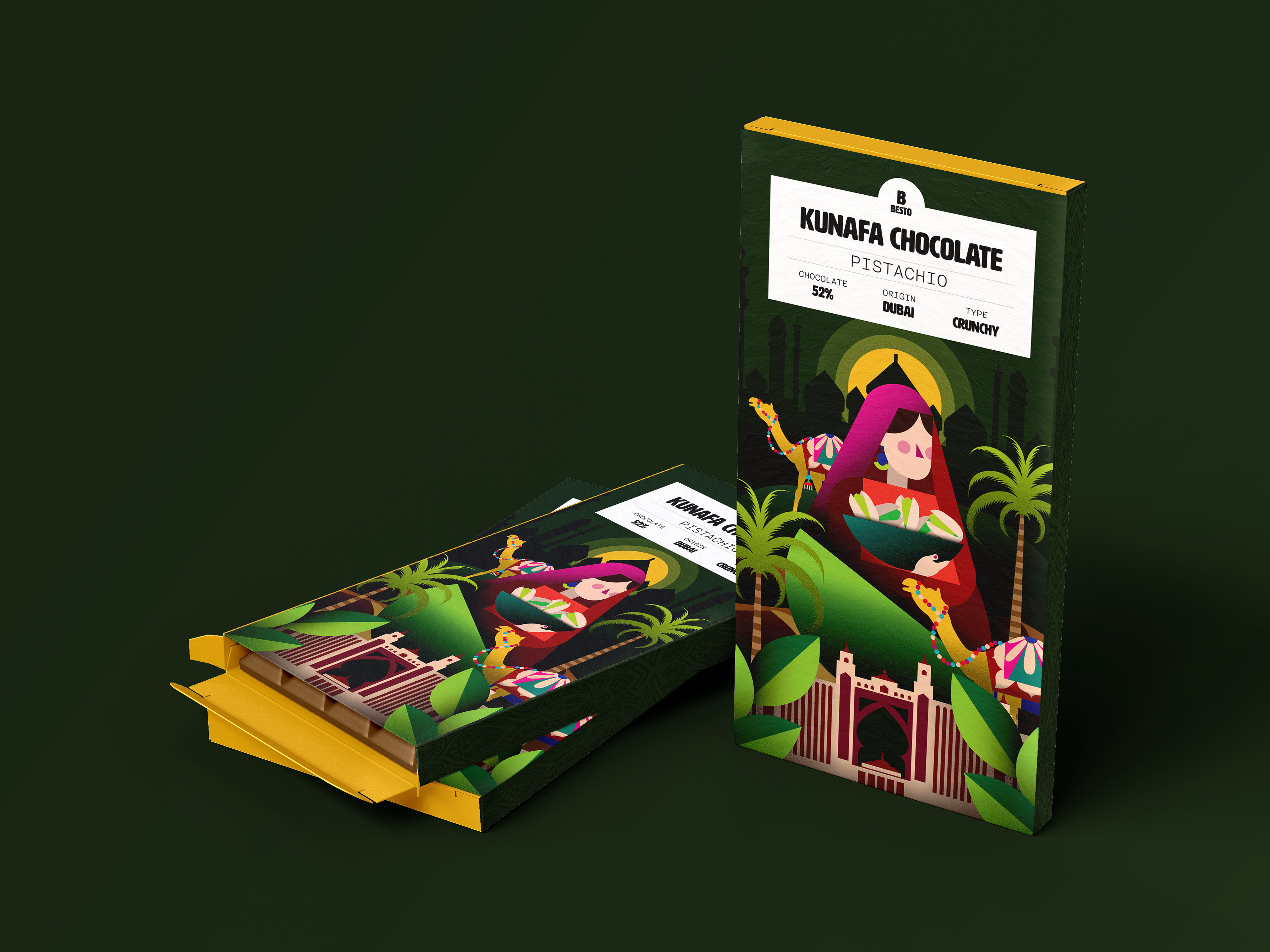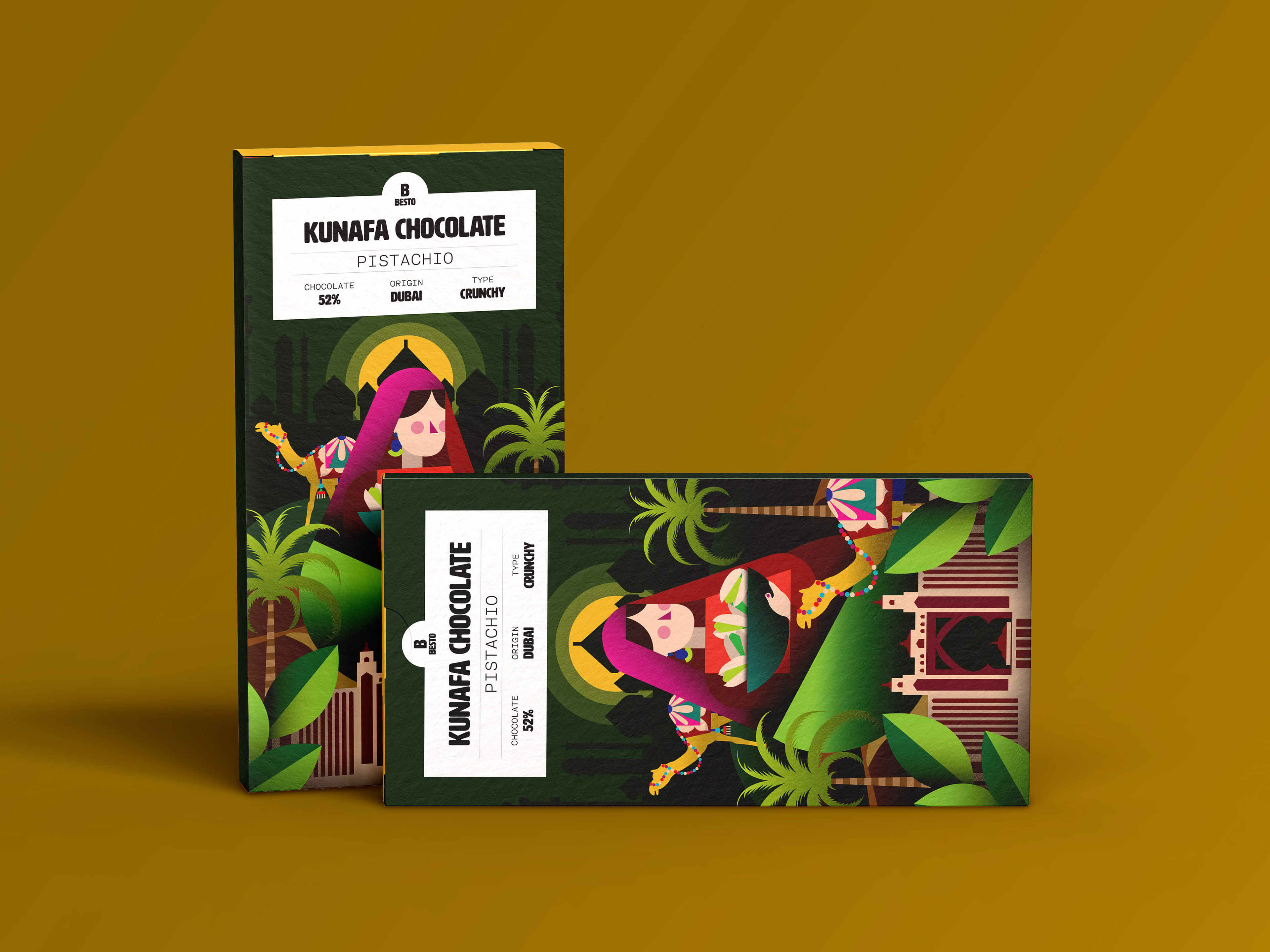 The Dubai chocolate packaging is inspired by the essence of the city, its iconic architecture, vibrant colors, and the rich flavor of the chocolate itself. The design features a vector illustration of a woman holding pistachios, surrounded by elements inspired by Dubai’s unique culture and landscape. The goal was to create a modern, eye-catching package that stands out, tells a captivating story, and makes for a fun, memorable souvenir.